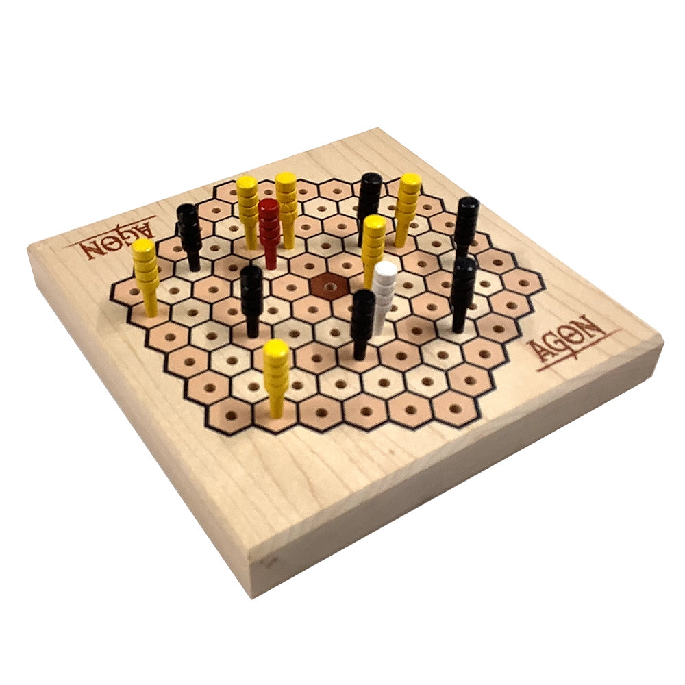 Agon is a classic 2-player strategy game with hexagonal board. Players pursue a positional goal with precise movement rules. Pieces taken by custodial capture are returned to the game, not eliminated.