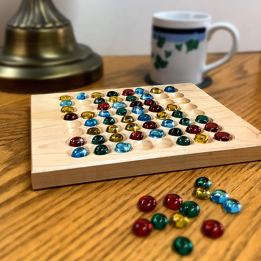 This deluxe version features a 7x8.5-inch maple wood board, and 64 colored gems (16 each of 4 colors). Made in the USA for age 12+. Average game time is 20 minutes.