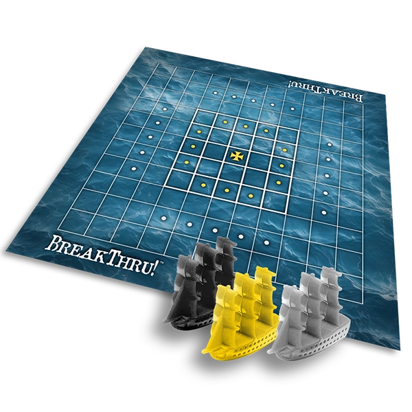 BreakThru! is a classic strategy board game from legendary game designer Alexander Randolph. Originally published in 1965 by 3M, this modern adaptation of Viking tafl games allows two players to wage epic sea battles. Choose your side: the Gold Ship and her 12 gray escort ships, or the powerful blockade of 20 ships of the Black Fleet. Made in the USA for two players age 8+.