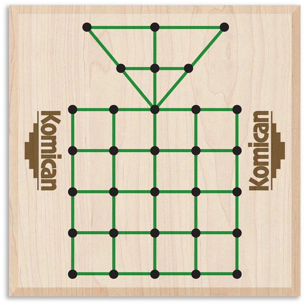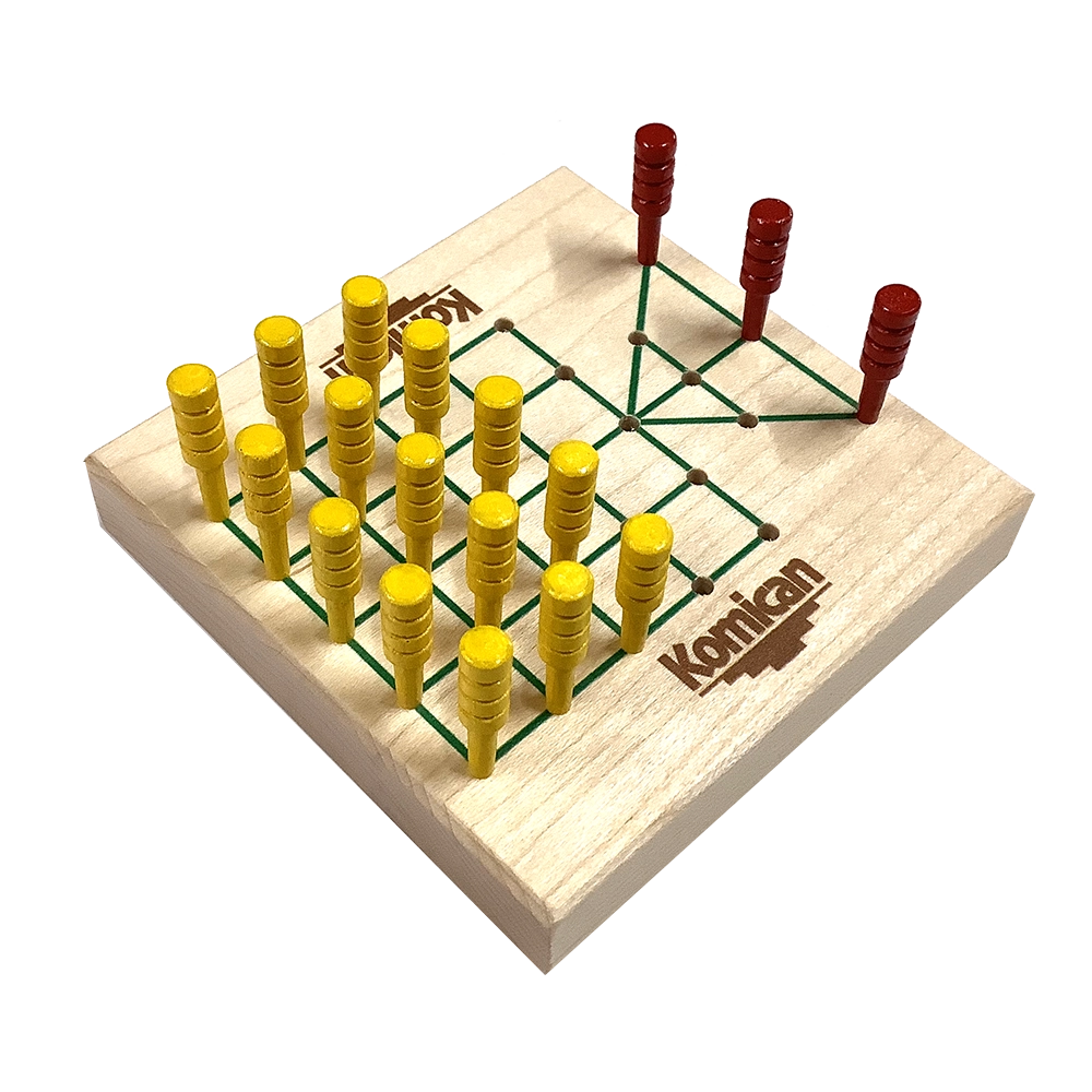 Predator-versus-Prey games are popular in many diverse cultures. One player has control of a predator attempting to capture a number of victims, the other player maneuvers a herd of animals attempting to entrap the predator so they can’t move. In this South American version, a win is also achieved by the prey occupying the predator’s den. It’s said that this game is much older, perhaps even an Incan pastime. Made in USA for 2 players age 8+.