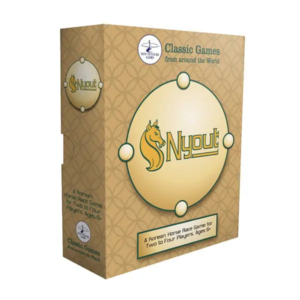 This race game for 2 to 4 players comes to us from Korea. Very similar games have been played in other cultures as well. It's a horse race, and each player has four horses. The moves are determined by tossing four coins, and players may send opposing pieces back to the start if they end their movement on the same space. The race starts at North, there are shortcuts on the board at the East, South, and West points, and horses cross the finish line by existing at the North where they began. Unlike some race games, there are no "safe" spaces, so your horses might get sent back to start at any time. The shortcuts will help, but don't count on them to win the game.