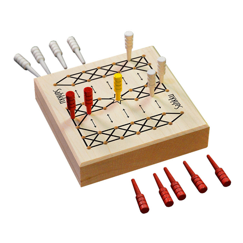 In the north country known as Scandinavia live the Sami people. There they play a running fight game called Sahkku. It's popularity there is shown by the annual championship games and prestigious trophies they give to the winners. The game may be as old as 1,000 years or more, and simulates a battle between two groups of warriors. These warriors start the game asleep, and before they can enter the battle they must be awakened by a specific role of the dice. Thereafter, they move and capture opposing pieces by ending their turn on an occupied space. The path can be blocked by opposing pieces, sending them back to their starting row. There's also a fickle King with special powers in the game, who joins up with either side when captured. A very different kind of game, one of only a few known to history. Made in USA for two players age 8+.