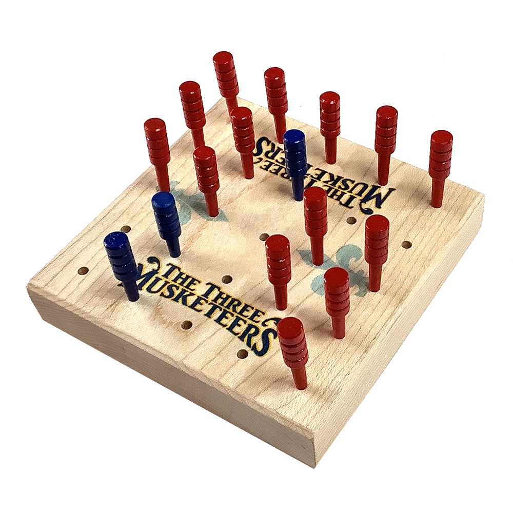 Created by Canadian game designer Haar Hoolim, this strategy game gained attention through Sid Sackson’s 1969 book, A Gamut of Games. It’s an asymmetrical game for 2 players, one player moving the 3 “musketeer” pieces, while the other commands a group of guards. The musketeers are attempting to form into a specific pattern, the guards trying to keep them from doing so. But the guards are restricted to capturing moves only. Made in USA for 2-6 players age 8+.