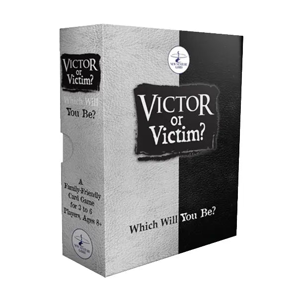 A quick card game where the cards depict the letters of "victor" and "victim" in letters of red, yellow, and blue, plus a handful of special cards that can influence the flow of the game. Beginning with three random letter cards face-up on the table, each player draws a card on their turn then decides which of their cards to pass along to the next player. Through this simple choice, they're trying to force the other players to spell the word "victim" (eliminating them from the game) or to spell the word "victor" from their own cards (thus winning the game). Simple, fast, and fun, Victor or Victim is a great family game for any place and any time. Made in USA for 3-5 players age 6+.